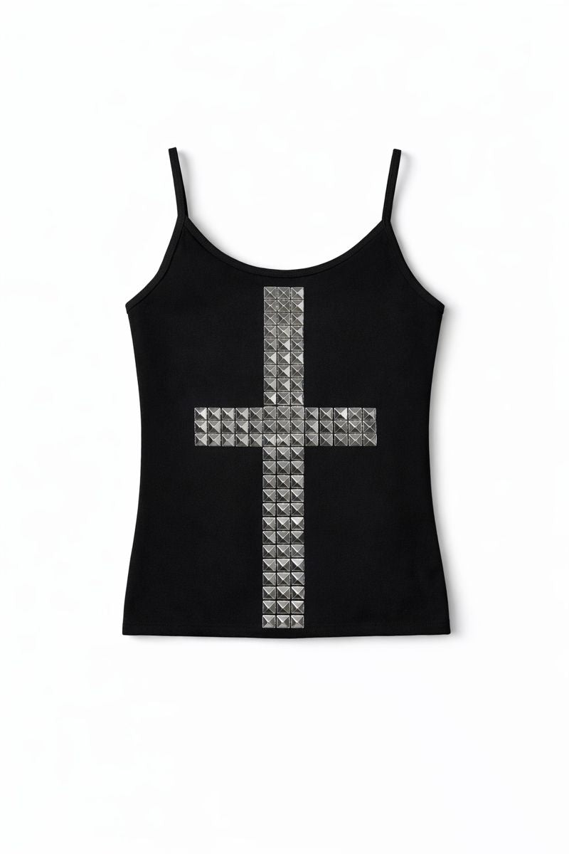 ✦ Details Soft, smooth stretch fabric Metallic pyramid-studded cross detail Spaghetti straps Slim, fitted silhouette Lightweight and breathable Pull-on style